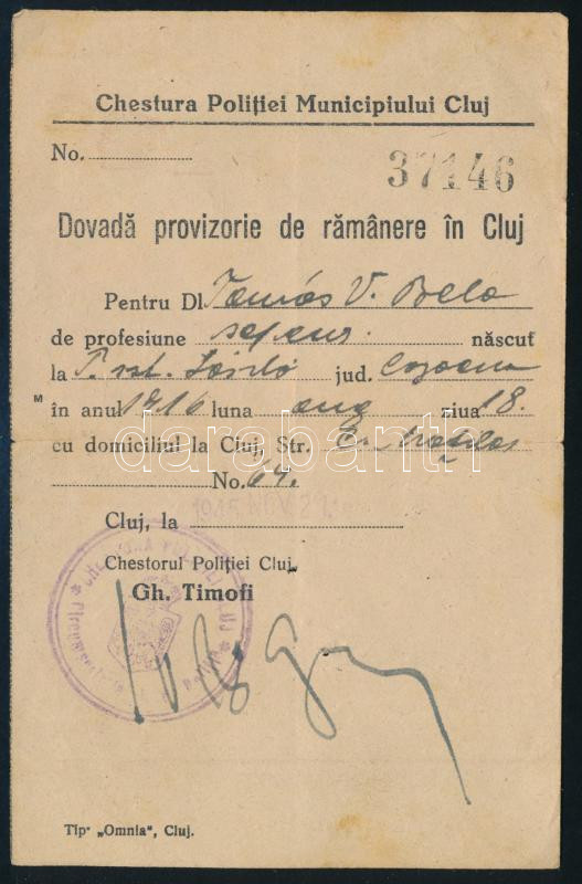1945 Kolozsvár Ideiglenes tartózkodási engedély, 14x9 cm https://www.darabanth.com/de/500-Fernauktion/500.0/Kunst-Dokumente-andere-Sammelgebiete/Dokument~1000001/1945-Kolozsvar-Ideiglenes-tartozkodasi-engedely-14x9-cm~II3407782