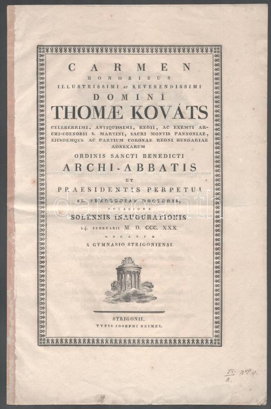 1830 Carmen honoribus illustrissimi ac reverendissimi domini Thomae Ko... https://www.darabanth.com/de/500-Fernauktion/500.0/Kunst-Dokumente-andere-Sammelgebiete/Drucksachen~1000015/1830-Carmen-honoribus-illustrissimi-ac-reverendissimi-domini-Thomae-Kovats-Strigonii~II3407976