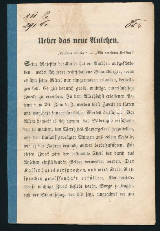 1854 Államkölcsön jegyzésére felszólító császári parancs magyarázata n... https://www.darabanth.com/de/500-Fernauktion/500.0/Kunst-Dokumente-andere-Sammelgebiete/Drucksachen~1000015/1854-Allamkolcson-jegyzesere-felszolito-csaszari-parancs-magyarazata-nemet-nyelven-31p~II3408023