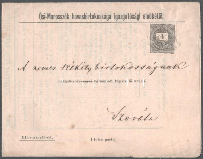 Beschreibung: 1892 Ősi Marosszék (Erdély) havasbirtokossága igazgatósági elnöke beszámolója a nemes székely szovátai határ havas-bortokosaihoz 4p. hajtva, postán elküldve