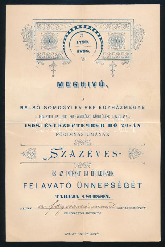 1898 Csurgó, Meghívó a Belső-Somogyi ev, ref. egyházmegye gimnázium fő... https://www.darabanth.com/de/500-Fernauktion/500.0/Kunst-Dokumente-andere-Sammelgebiete/Drucksachen~1000015/1898-Csurgo-Meghivo-a-Belso-Somogyi-ev-ref-egyhazmegye-gimnazium-foepuletenek-avato-unnepsege-4~II3407714