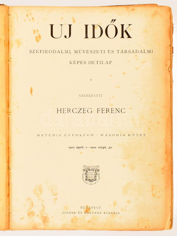 1901 Új idők VII. évf. II. kötet. 27-52. sz. 1901 ápril. 1. - szept. 30. Szerk.: Herczeg Ferenc. Bp., Singer és Wolfner,4+568 p. Korabeli aranyozott egészvászon-kötés, kopott borítóval, foltos lapokkal, sérült kötéssel és kijáró lapokkal.