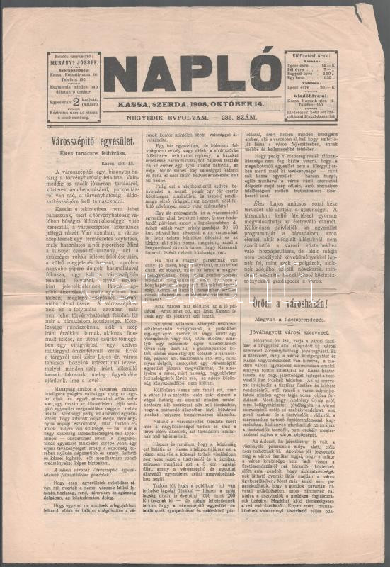 1908 Napló IV. évf. 235. szám, Kassa, 1908. okt. 14., lapszéli sérülés... https://www.darabanth.com/de/500-Fernauktion/500.0/Kunst-Dokumente-andere-Sammelgebiete/Drucksachen~1000015/1908-Naplo-IV-evf-235-szam-Kassa-1908-okt-14-lapszeli-serulesekkel-4-p~II3408082
