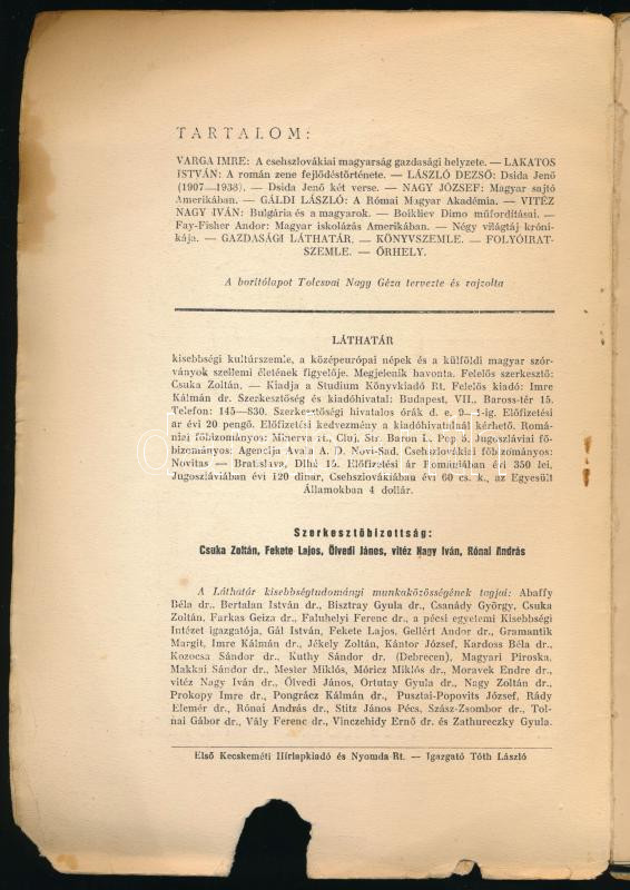 1938 Láthatár. Kisebbségi kultúrszemle. A külföldi magyarok és középeurópai népek szellemi életének figyelője. VI. évf. 7-8 sz. 1938. júl.-aug. Fekete-fehér fotókkal illusztrálva. Kiadói papírkötés, sérült, foltos borítóval, néhány foltos, kijáró lappal.