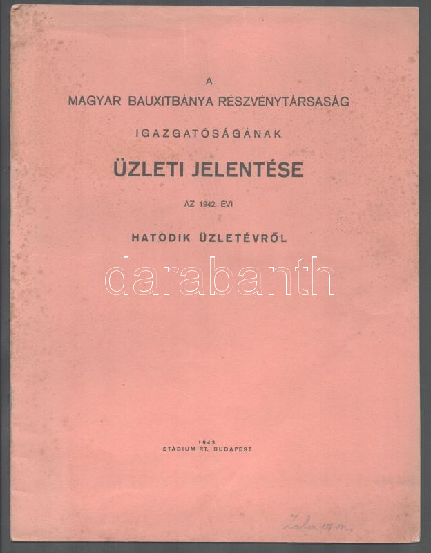 1943 A Magyar Bauxitbánya Rt. igazgatóságának üzleti jelentése az 1942. évi hatodik üzletévről. Bp., 1943, Stádium, 8 sztl. lev. Papírkötés, foltos borítóval.
