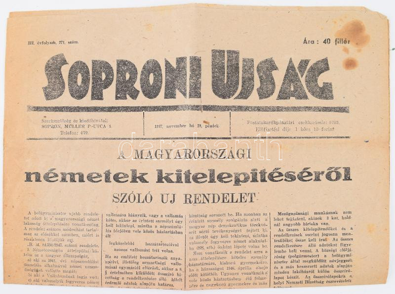 1947 A magyarországi németek kitelepítéséről szóló rendelet a Soproni ... https://www.darabanth.com/de/500-Fernauktion/500.0/Kunst-Dokumente-andere-Sammelgebiete/Drucksachen~1000015/1947-A-magyarorszagi-nemetek-kitelepiteserol-szolo-rendelet-a-Soproni-ujsagban~II3407165