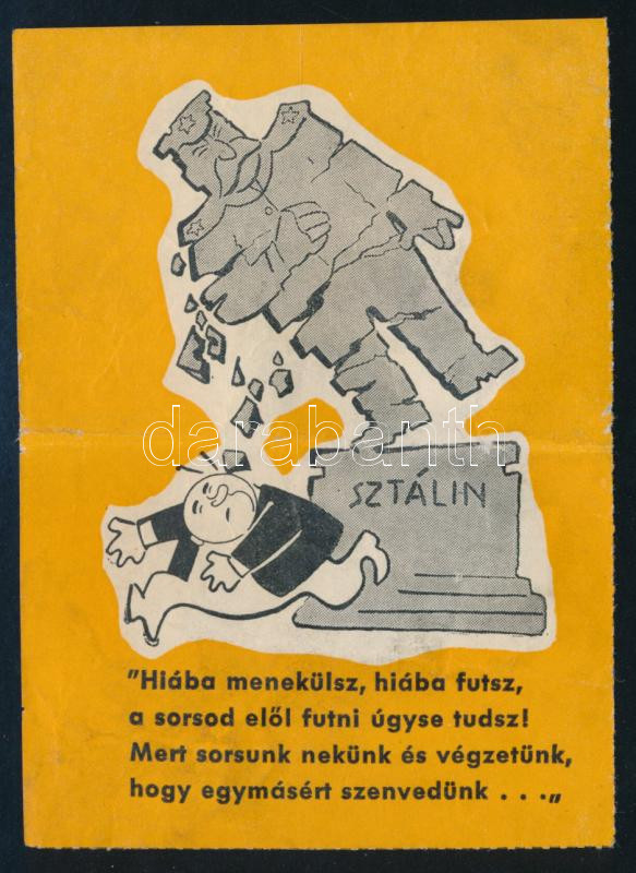 Beschreibung: 1956 Hiába menekülsz... Sztálin bukása Rákosi Mátyásét is elhozta, humoros röplap Karády sláger szövegével, a ledöntött Sztálin szoborral 9x12 cm