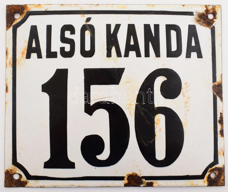Régi zománcozott fém tábla "Alsó Kanda 156" felirattal, zománchibákkal... https://www.darabanth.com/de/500-Fernauktion/500.0/Kunst-Dokumente-andere-Sammelgebiete/Flohmarkt~500010/Regi-zomancozott-fem-tabla-Also-Kanda-156-felirattal-zomanchibakkal-rozsdafoltokkal-15x18-cm~II3405478