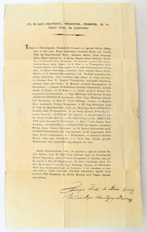 1821 Tornallyai Tornallyay Márton (1759-1828) felséges király beiktató... https://www.darabanth.com/de/500-Fernauktion/500.0/Kunst-Dokumente-andere-Sammelgebiete/Historische-Dokumenten-Handschriften~1000018/1821-Tornallyai-Tornallyay-Marton-1759-1828-felseges-kiraly-beiktato-szemely-autograf-alairassal~II3411424