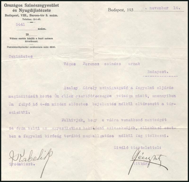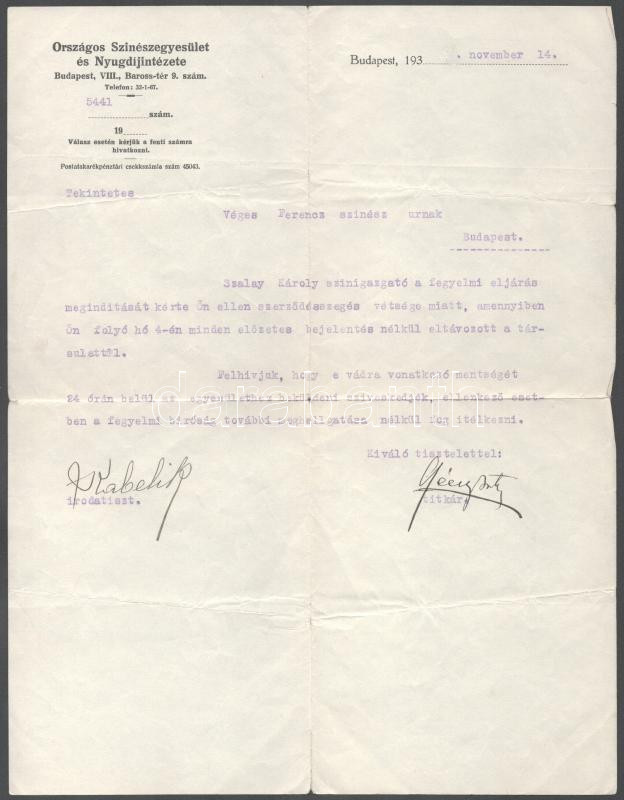 1933 Bp., az Országos Színészegyesület felszólító levele Véges Ferenc színész részére, szerződésszegés miatt ellene indított fegyelmi eljárás ügyében, aláírásokkal