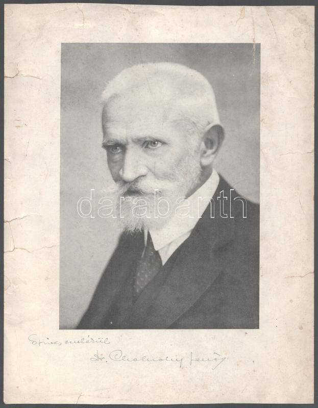 Beschreibung: cca 1930-1940 Cholnoky Jenő (1870-1950) földrajztudós DEDIKÁCIÓJA egy őt ábrázoló nyomaton, sérült, foltos, 32x25 cm