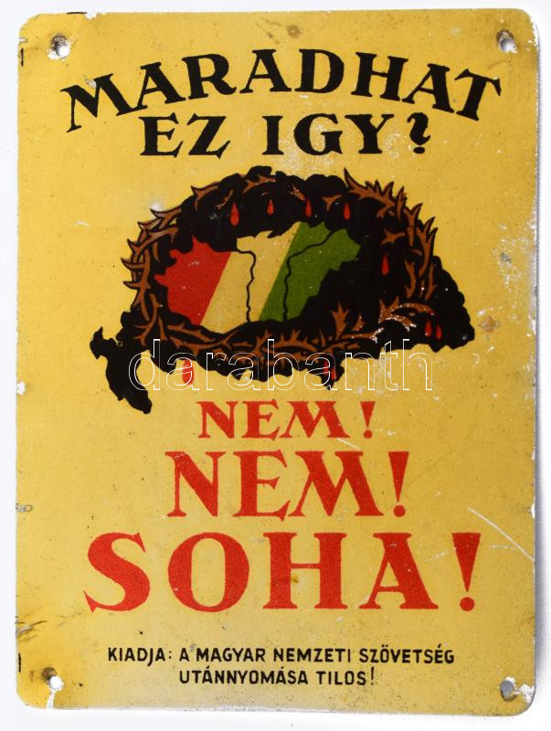 Beschreibung: cca 1930 "Maradhat ez így? Nem! Nem! Soha!" irredenta fém kártya, kiadja: Magyar Nemzeti Szövetség, kopásnyomokkal, 8×6 cm