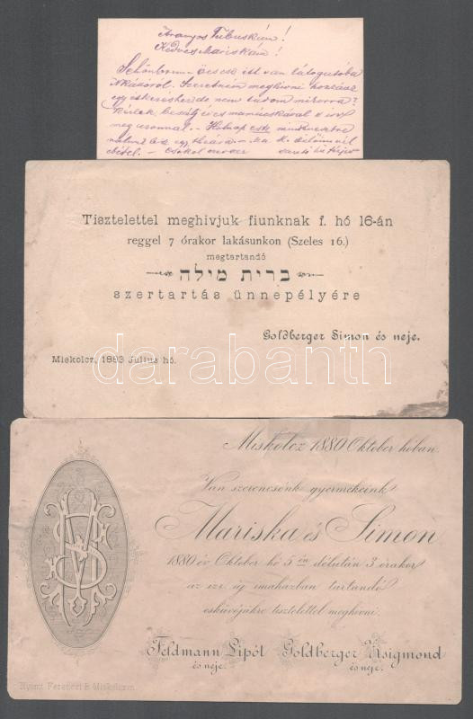 1880-1883 2 db meghívó és egy megírt névjegy a Miskolci illetőségű Fel... https://www.darabanth.com/de/500-Fernauktion/500.0/Kunst-Dokumente-andere-Sammelgebiete/Judaica~1000007/1880-1883-2-db-meghivo-es-egy-megirt-nevjegy-a-Miskolci-illetosegu-Feldmann-es-Goldberger-csaladtol~II3409028