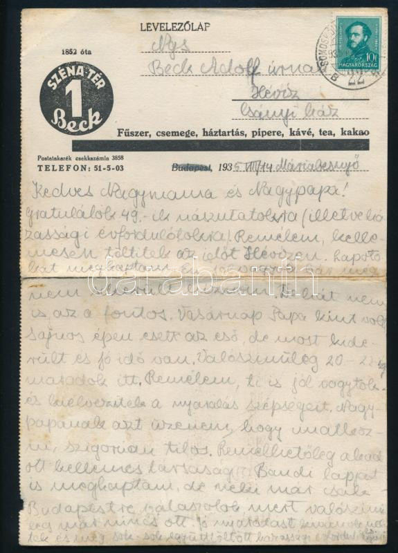 1935 Szétnyitható levelezőlap a Beck család levelezéséből fűszer, kávé... https://www.darabanth.com/de/500-Fernauktion/500.0/Kunst-Dokumente-andere-Sammelgebiete/Judaica~1000007/1935-Szetnyithato-levelezolap-a-Beck-csalad-levelezesebol-fuszer-kave-tea-stb-reklammal~II3409027