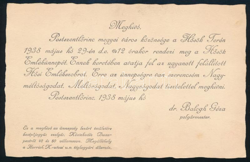 Beschreibung: 1938 Pestszentlőrinc Hősi emlékmű avatására szóló meghívó
