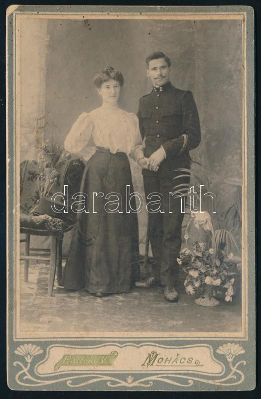 Beschreibung: ca 1900 Mohács, csendőr a kedvesével kabinetfotó 17x21 cm