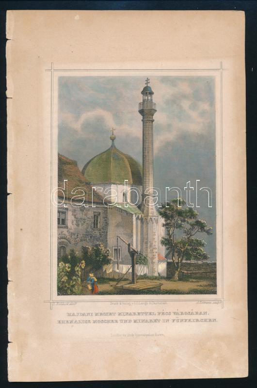 Ludwig Rohbock (1820-1883) - A. Rottmann: Hajdani mecset minarettel Pécs városában / Ehemalige Moschee und Minaret in Fünfkirchen. Színezett acélmetszet, papír, jelzett a metszeten, kis lapszéli sérülésekkel, kissé foltos, 16x12 cm