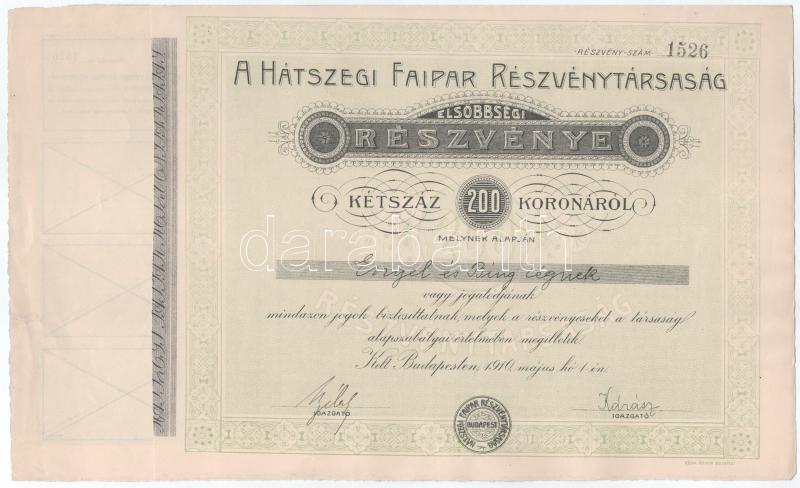 Budapest 1910. "Hátszegi Faipari Részvénytársaság" elsőbbség... https://www.darabanth.com/de/500-Fernauktion/500.0/Numismatik/Aktien-und-Tickets~1500052/Budapest-1910-3Cem3EHatszegi-Faipari-Reszvenytarsasag3Cem3E-elsobbsegi-reszvenye-200K-rol-~II3403257