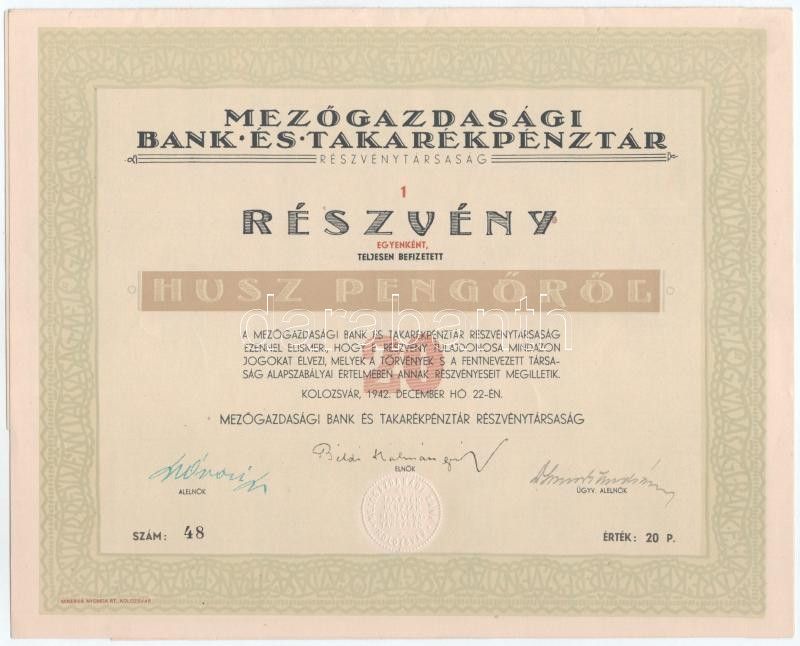 Romania / Cluj-Napoca 1942. "Agricultural Bank and Savings Bank" shares, one for 20 Pengő each, fully paid, with embossed stamp, with coupons C:XF