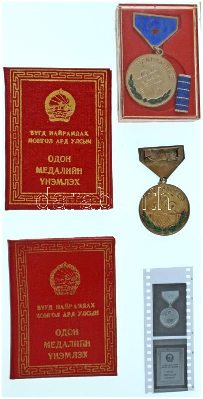 Mongólia 1970-1971. "Barátság Érem" 2db zománcozott, jelzetlen Ag kitüntetés, mindkettő igazolvánnyal, egyik miniatűrrel és fotónegatívval, együtt, sérült dísztokban T:AU,XF