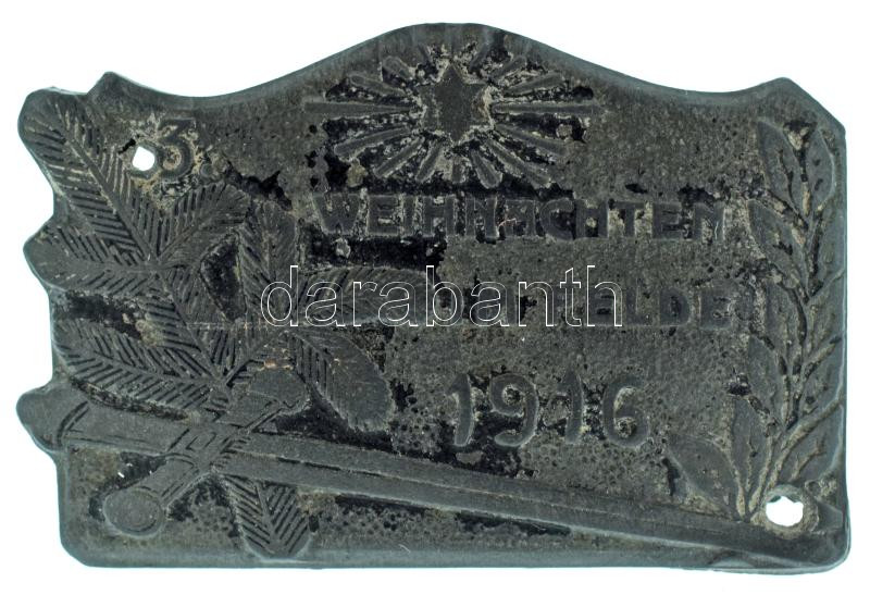 1916. "3. karácsony a harcmezőn" Zn sapkajelvény hátoldalon "K.U.K. KRIEGSFÜRSORGEAMT" felirattal és "WINTER & ADLER AG WIEN" gyártói jelzéssel T:VF bal felső és jobb alsó saroknál kifúrva, tűhiány