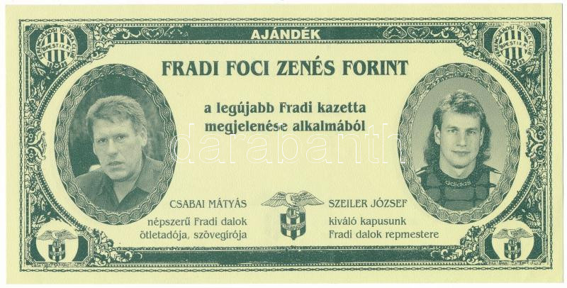 ~1990-2000. "Fradi Foci Zenés Forint - a legújabb Fradi kazetta m... https://www.darabanth.com/de/500-Fernauktion/500.0/Numismatik/Notgeld-aus-Papier-und-Metall~1500053/7E1990-2000-3Cem3EFradi-Foci-Zenes-Forint-a-legujabb-Fradi-kazetta-megjelenese-alkalmabol3Cem3E~II3409952