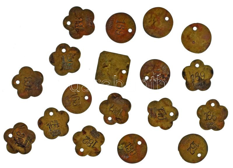 DN "Fischer" bronz bárca (18x), "102-187" közötti sorszámmal 10xklf virágformájú bárcák (32x33mm) + "130-177" közötti sorszámmal 7xklf körformájú bárcák (30mm) + "48" sorszámmal négyzetformájú bárca (32x33mm), mindegyik "FISCHER BUDÁN" gyártói jelzéssel T:XF,VF, patina