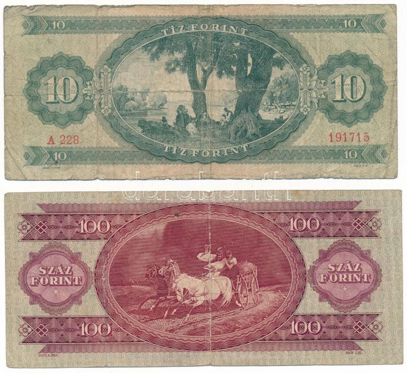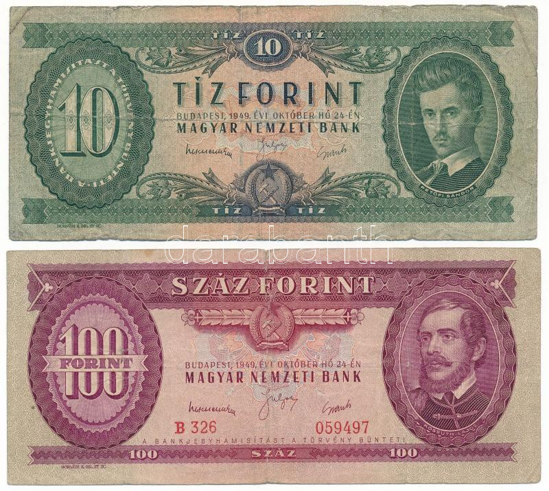 1949. 10Ft "A 228 191715" + 100Ft "B 326 059497" T... https://www.darabanth.com/de/500-Fernauktion/500.0/Numismatik/Ungarische-Banknoten~1500054/1949-10Ft-A-228-191715-plus-100Ft-B-326-059497-TF-VG3Cbr-3E-Adamo-F3-F283Cbr-3E~II3407771