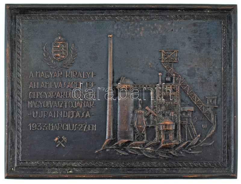 1933. "A Magyar Királyi Állami Vas-, Acél- és Gépgyárak diósgyőri nagyolvasztójának újraindítása 1933. március 27-én" egyoldalas bronz plakett (80x109mm) T:XF