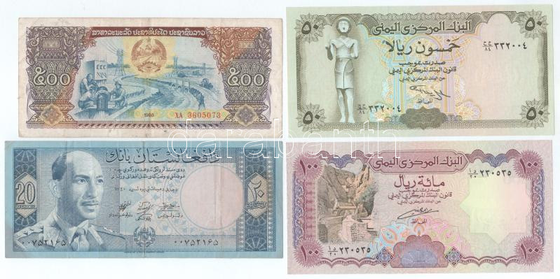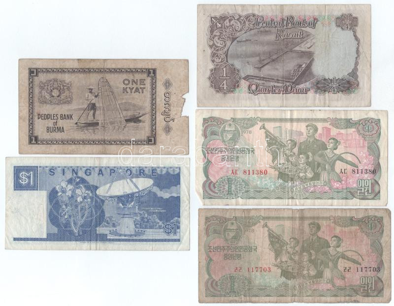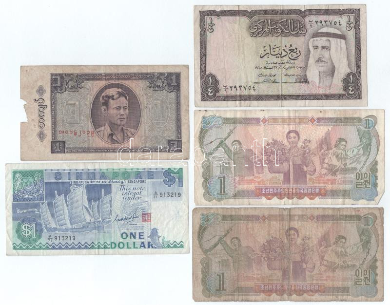 Vegyes, 9db-os külföldi bankjegyből álló tétel, közte Szingapúr DN(1987) 1$ + Laosz 1988. 500K, stb. T:F,VG közte az egyik kis anyaghiánnyal, közte 2db AU