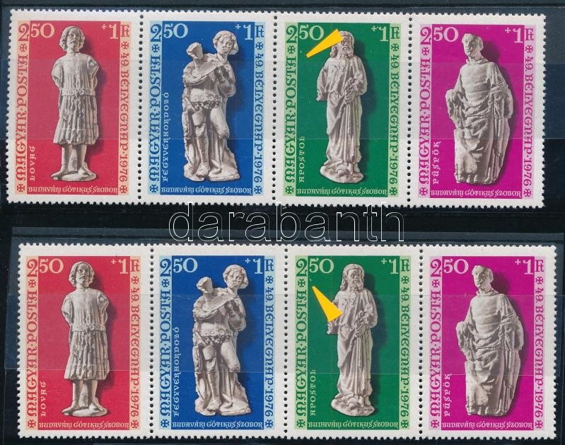 Beschreibung: 1976 Bélyegnap - Budavári gótikus szobrok 2 db 4-es csík, mint kettőben a 2,50Ft-on az értékszám alatt világos zöld pont