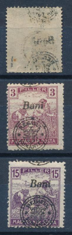 Beschreibung: Nagyvárad 1919 3 db elcsúszott felülnyomás, az egyik ívszínátnyomat (15f rozsda, szakadás / stain, torn)