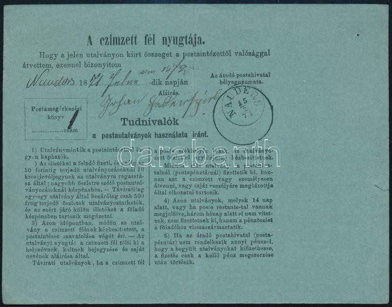 Beschreibung: 1871 Kék színű postautalvány 5kr bérmentesítéssel "KÖRMÖCZBÁNYA" - "NAUDERS" Ex Ryan