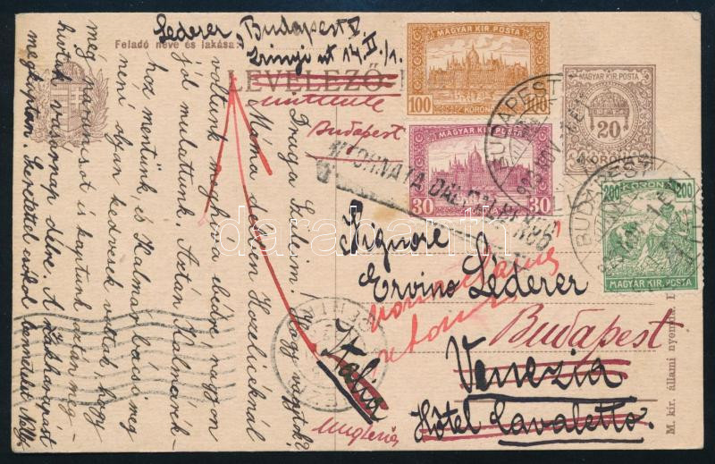 Beschreibung: 1923 Díjjegyes levelezőlap Arató-Parlament 330K díjkiegészítéssel Velencébe, majd visszaküldve Budapestre