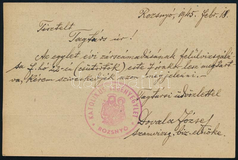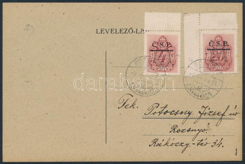 Beschreibung: Rozsnyó 1945 Helyi portózott levelezőlap / Local postcard with postage due stamps. Signed: Bodor