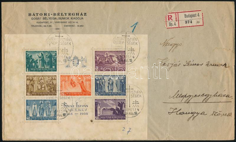 Beschreibung: 1938 Ajánlott levél Szent István blokkal, alkalmi bélyegzéssel "BUDAPEST" - Medgyesegyháza