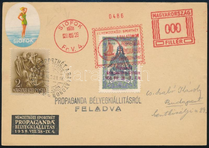 Beschreibung: 1938 Nemzetközi sporthét levelezőlap levélzáróval és alkalmi bélyegzéssekkel