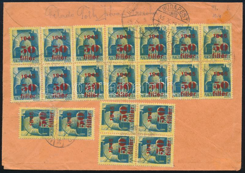 Beschreibung: 1945 (3. díjszabás) Budapest helyi levél 20 db Kisegítő 50f/50f bélyeggel