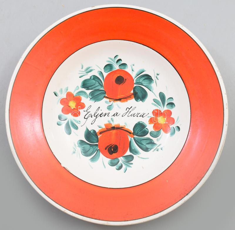 Beschreibung: Éljen a haza feliratos falitál, jelzett, kopással, d: 23 cm