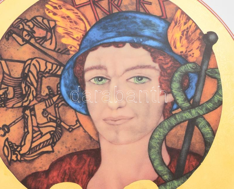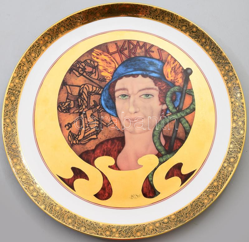 Beschreibung: Hollóházi porcelán dísztál Faragó Miklós (1947- ) által tervezett: Klasszikus Jubileumi Kollekció - Hermes dekorral. Limitált szériás. Kézzel sorszámozott: 25/225, levonóképes, aranyozott, jelzett, hibátlan, d: 31 cm