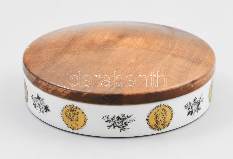 Beschreibung: Wallendorf női arcmintás porcelán krémes tégely, fa fedéllel, matricás, jelzett, apró kopásokkal, d: 12 cm