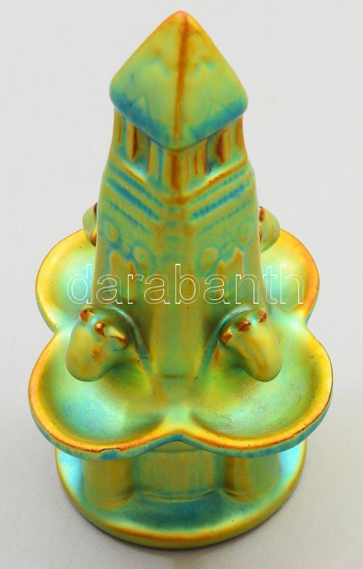 Beschreibung: Zsolnay kisplasztika - pécsi Zsolnay-kút. Terv.: Sinkó András. Savmaratott felületű, többféle eozin mázakkal fedett finomfajansz. Jelzett, hibátlan, m: 13,5 cm