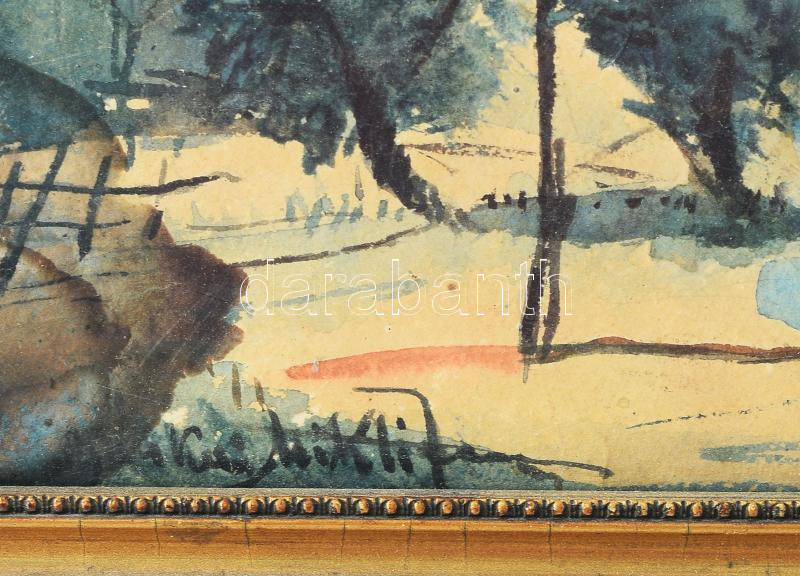 Beschreibung: B. Mikli Ferenc (1921-2013): Táj. Akvarell, papír, jelzett, foltos, üvegezett fakeretben, 24×31,5 cm