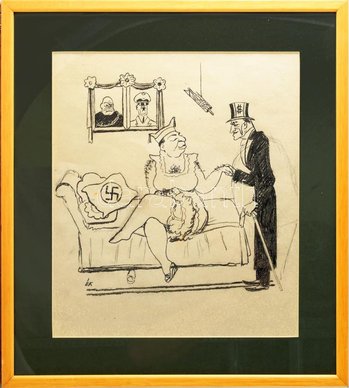 Ék Sándor (1902-1975): Lánykérő (politikai karikatúra, Hitler arcképpe... https://www.darabanth.com/de/501-Fernauktion/501.0/Gemalde-und-Grafiken/Gemalde-und-Grafiken~10/Ek-Sandor-1902-1975-Lanykero-politikai-karikatura-Hitler-arckeppel-a-falon-Ceruza-pap~II3410638