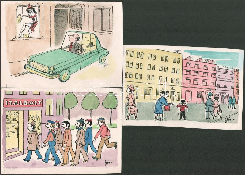 Szegő Gizi (1902-1985): 3 db karikatúra. Vegyes technika, papír, jelzett, mindegyik hátoldalán "Ludas Matyi Szerkesztősége" bélyegzővel, feliratozva, 14x20 cm körüli méretben