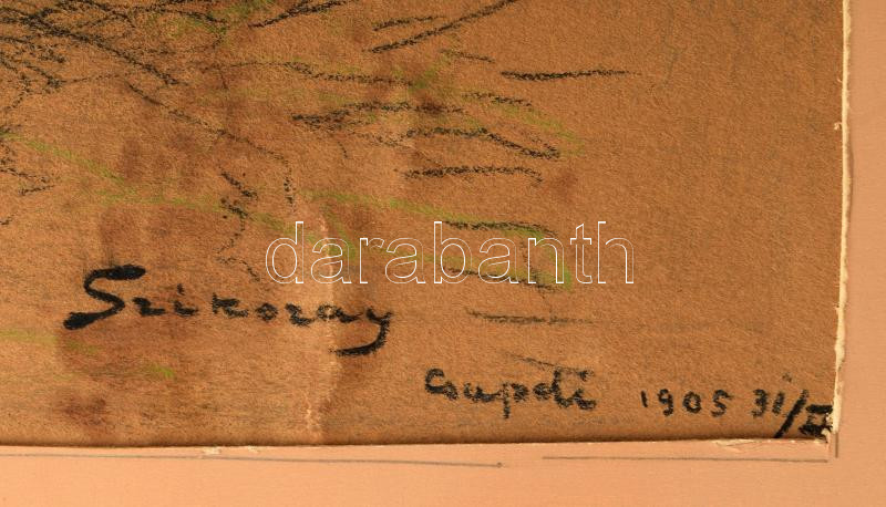 Beschreibung: Szikszay Ferenc (1870-1908): Vándor a tájban (Csabdi?), 1905. Ceruza, papír, jelezve jobbra lent, sérült, foltos. Paszpartuban.