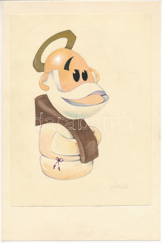 Jelzés nélkül: Szerzetes (Mönch, humoros-karikaturisztikus rajz). Akvarell, ceruza, papír. Papírra kasírozva. 23x17 cm