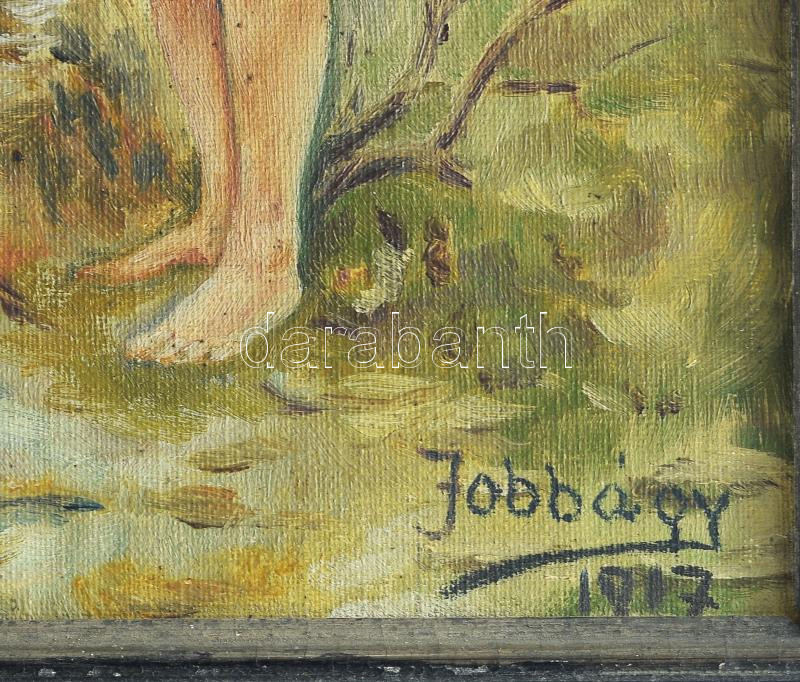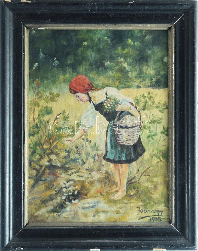 Jobbágy jelzéssel (XX. sz. eleje): Virágszedő lány, 1917. Olaj, vászon, kartonon. Hátoldalán Tóth Gyula debreceni képkeretező bélyegzésével. Antik, kissé sérült fakeretben. 34×25 cm