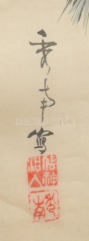 Beschreibung: Olvashatatlan jelzéssel, távol-keleti alkotó: Ragadozómadár. Akvarell, selyem. Feltekerve. 123x39 cm