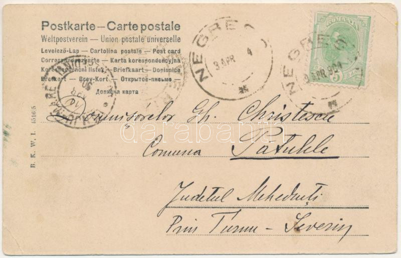 1904 Húsvéti üdvözlőlap, montázs színes tojásba öltözött emberekkel és nyúllal. B. K. W. I. 4516/5 / Easter greetings, montage with people dressed as colorful eggs and rabbit (ázott / wet damage)